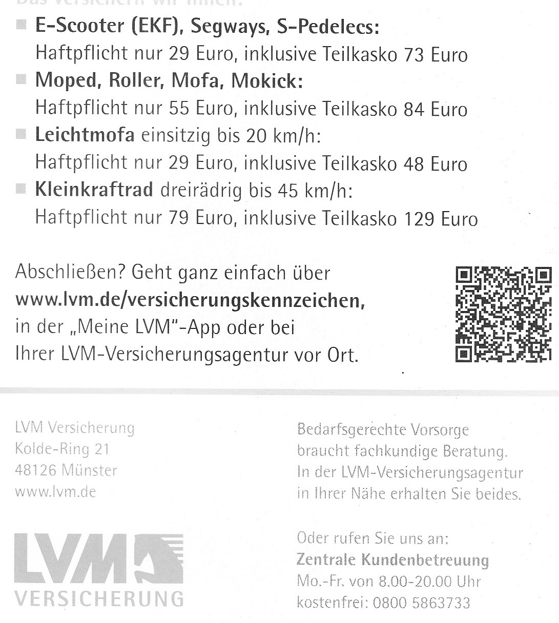Das günstigste gibt es bei der LVM für Leichtmofas für 29 Teuro.
