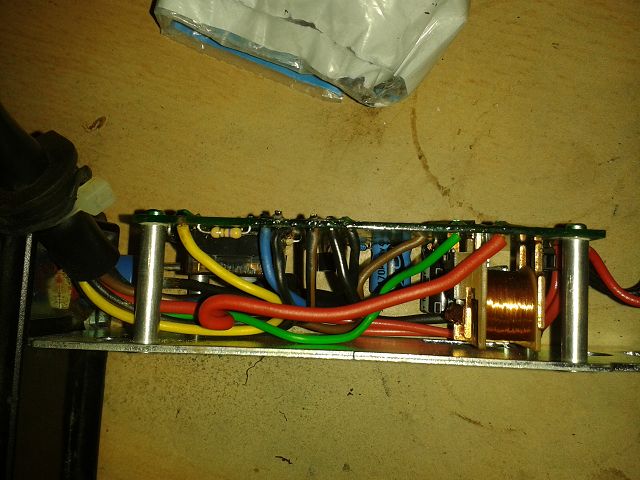 nur zur Info: in der Elektronikbox sind eigentlich nur drei für den E- Start relevante Bauteile platziert: das Starter- Relais (mit der sichtbaren Spule), die dazugehörige Freilaufdiode und der Schlüsselschalter.
