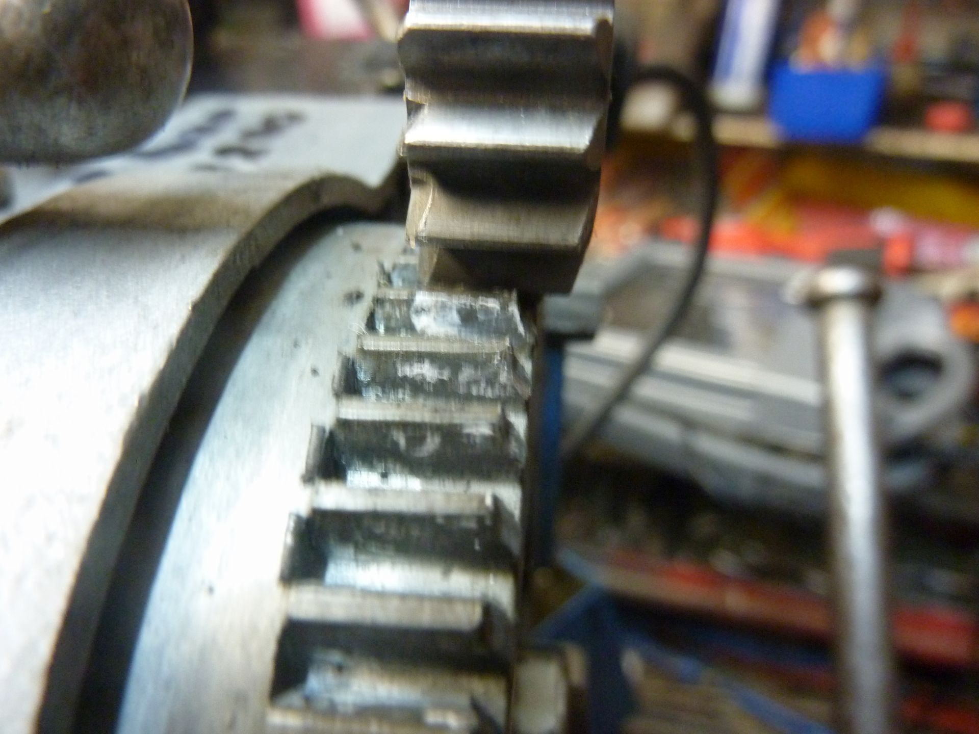 Und genau da hege ich einen anderen Gedankengang . Das Ritzel stützt sich an der Buchse ab .Die über die Polradzähne rausragenden Ritzelzähne drücken außermittig auf die Kanten der Polradzähne . Die treibende/drehende Kraft hebt das Ritzel auf der Welle dabei leicht und Schieflauf entsteht . Genau dieser Schieflauf frißt dann an den Zahnkanten der Polradzähne weil : Die Ritzelzähne stehen ja über.Geht auch gar nicht anders, denn je höher die auf das Polrad übertragene Kraft wird, desto stärker wächst auch der Druck vom Ritzel auf die Buchse. Das Ritzel kippt daher also umso weniger, je mehr Kraft aufs Polrad übertragen wird.