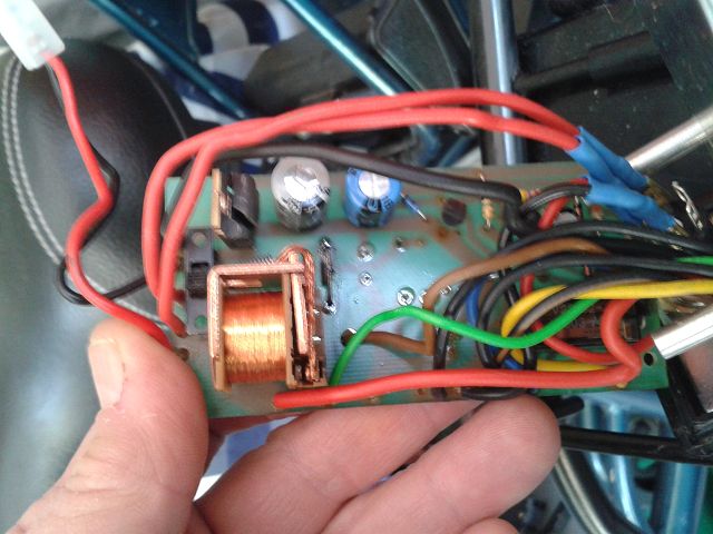 nur zur Info: in der Elektronikbox sind eigentlich nur drei für den E- Start relevante Bauteile platziert: das Starter- Relais (mit der sichtbaren Spule), die dazugehörige Freilaufdiode und der Schlüsselschalter.