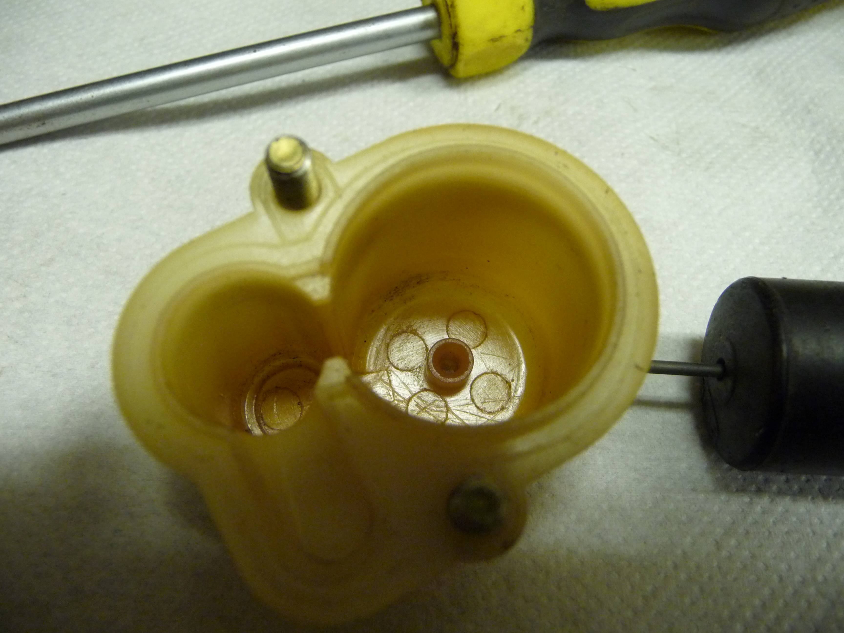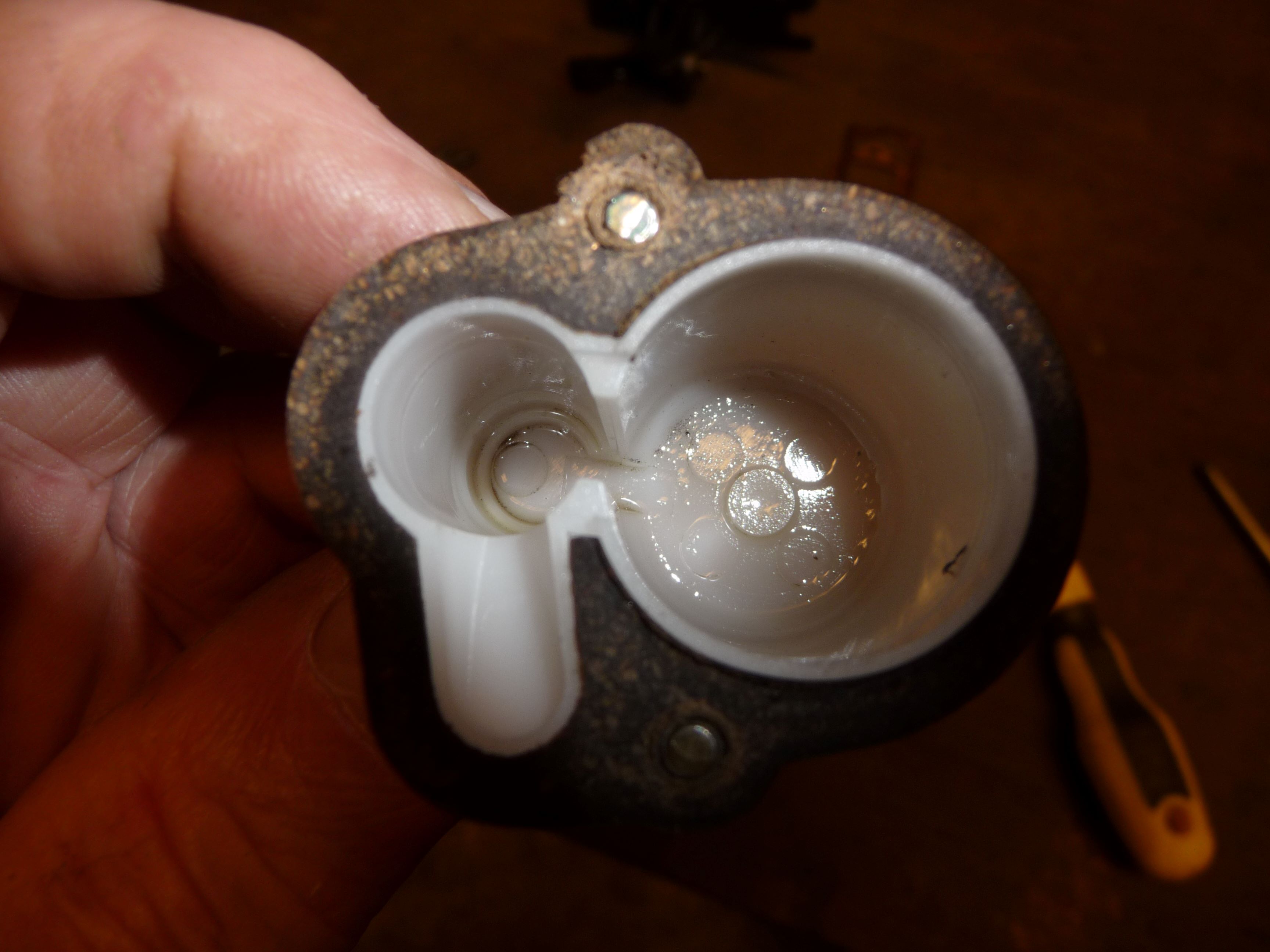 Ich habe daraufhin den Vergaser zerlegt und gereinigt, alle Einstellungen und Züge neu eingestellt, das Problem des Überlaufens war aber nicht weg. Vergaser wieder zerlegt, diesmal komplett und Membran geprüft. Wie erwartet Membran defekt. Alle Bestände an Membranen geprüft (5) und 2 weitere defekte gefunden.Vergaser komplett zerlegt mit Düsenstock, Schwimmernadelbuchse (neu) und Messingrohr Schiebergehäuse nochmals gereinigt, Schieberstellungen geprüft und mit geprüfter Membran wieder zusammengebaut (neue Schaumstoffringe, Papierdichtung und Dichtringe, Lichttest). Danach Dichtprüfung mit Unterdruck, Membran dichtet sauber in Stellung 0. Ebenso dicht in Schwimmernadelventil wenn Schwimmernadel in oberer Stellung. Dabei festgestellt, das der Bing 2 Arten von Schwimmergehäuse und Schwimmer hat (siehe Fotos). Wenn Choke auf Stellung 1 läuft aber weiterhin massiv Benzin aus dem Schiebergehäuse (aus Luftfilterstutzen, nicht aus Überlauf!). Wieder alles zerlegt und andere geprüfte Menbran eingebaut. Gleiches Ergebnis. Die Membranen haben keinen Defekt, der Stift wurde in die Membranen neu eingeklebt. Auch Einlage von 2 Papierdichtungen brachte nichts. Anscheinend liegt der Fehler in der Kunststoffzwischenplatte oder der Abdichtung aller Teile untereinander??