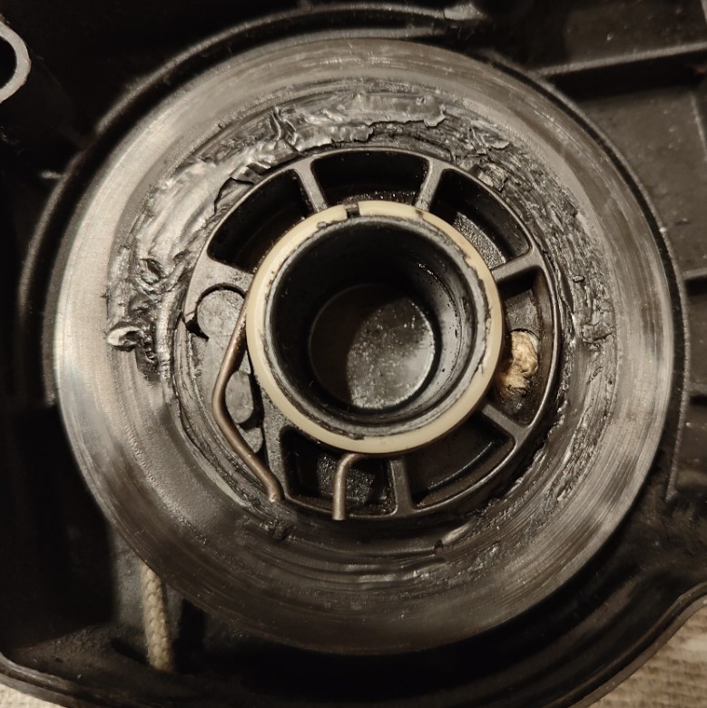 Es sieht so aus, als ob das Polrad zu heiß geworden ist und die Starterscheibe angeschmolzen hat.