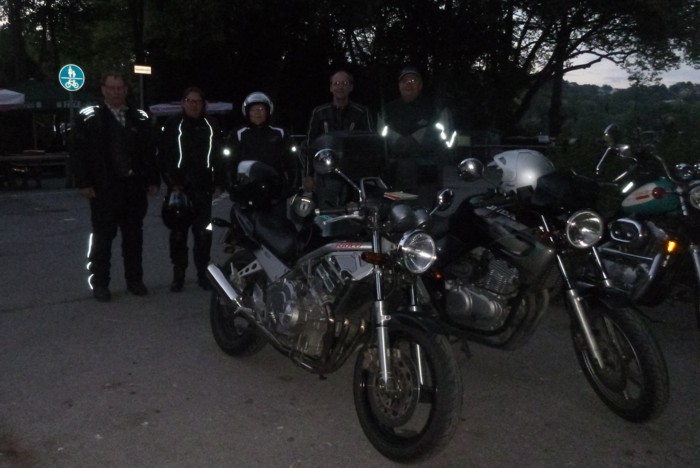 5 Saxonettenfahrer auf 2 Motorrädern und eine Harley.