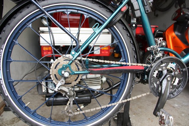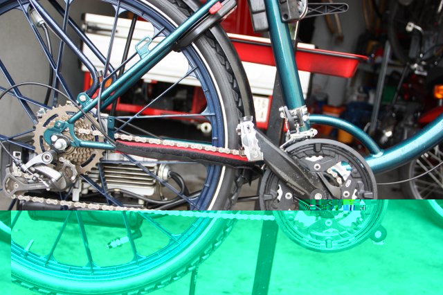 Auch die Shimano Alivio dreifach Kurbel f (123 mm Tretlagerachse) wurde jetzt gegen eine silberne Shimano Deore dreifach Kurbel (115 mm Tretlagerachse) ausgetauscht, damit die Kettenlinienführung besser passt. Ich habe dafür eine Thun Pressinnenlager von Brucker Radlservive (von mir auch gehässiger weise Presswurstinnenlager genannt) mit einer 127 mm Tretlagerachse verwendet. Kettenblatt Abstufung 48/36/24. Hinten habe ich ein Shimano Schraubkranz mit 14 bis 34 Zähne verwendet und ein XTR Inverse (negative Schaltwerk ) Schaltwerk für besseres und weicheres Schalten verbaut. Der Umwerfer ist ein Shimano Umwerfer für Anlöttsockel den ich mit einer einfachen Schlauchrohrschelle aus den Baumark kombiniert habe. Hier zu braucht man aber noch einen Anlöttsockel für Rennräder der eigentlich geschraubt wird. Diesen habe ich aber an die Schlauchrohrschelle durch einen Schweißer in meiner Arbeit anfertigen lassen, eben so wie den Seilzuggegenhalter.