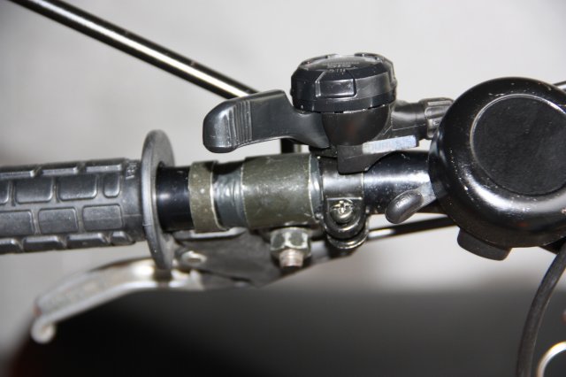 Oberes Copitt von Vorne, wo noch der Bremshebel der alten Magura Lousise zu sehe ist. Der Shimano Deore XT Daumenschalthebel wurde ebenfalls gegen eine 7fach Drehgriffschaltung ausgetauscht. Der Vorteil gegen der alten Konstruktion ist, dass ich jetzt immer am Gas bleiben kann, ohne die Hand vom Gasgriff nehmen zu müssen oder nicht dauernd die Hand verrenken muss beim Schalten wenn ich am Gas bin.