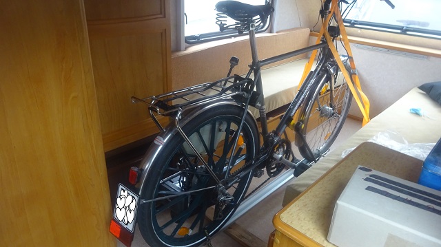 Nur eine darf hinten auf dem Gepackträger. Für meine Herrensaxonette habe ich für innen einen Fahrradständer gebaut und die Saxonette sicher festgezurrt. In den Bettkästen habe ich Halterungen für die Zurrgurte am Lenker eingebaut.