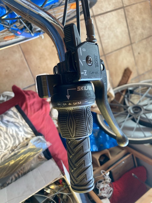 Die Schalthebel waren nicht so dolle. Also habe ich jetzt doch auf Drehgriffschaltung gewechselt. Natürlich mit Daumengas von @Sporti Bei der Gelegenheit gleich die Bowdenzugführung unten zum Kettenblattumwerfer erneuert. Ebenfalls mit 3D Druck und einem