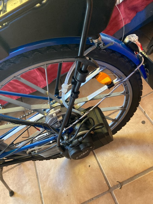 Bowdenzuggegenhalter für den Rahmen. Gefällt mir jetzt richtig gut und funktioniert Prima. Vorne die V-Brakes haben mir nicht gefallen, weil der Bowdenzug direkt auf dem Schutzblech lag. Also habe ich auf Cantilever gewechselt. Und zu guter Letzt musste ich eh mein gerissenes Starterseil erneuern und da man ja nicht der jüngste ist, gleich die noch vorhandene neue Seilführung mit eingebaut.