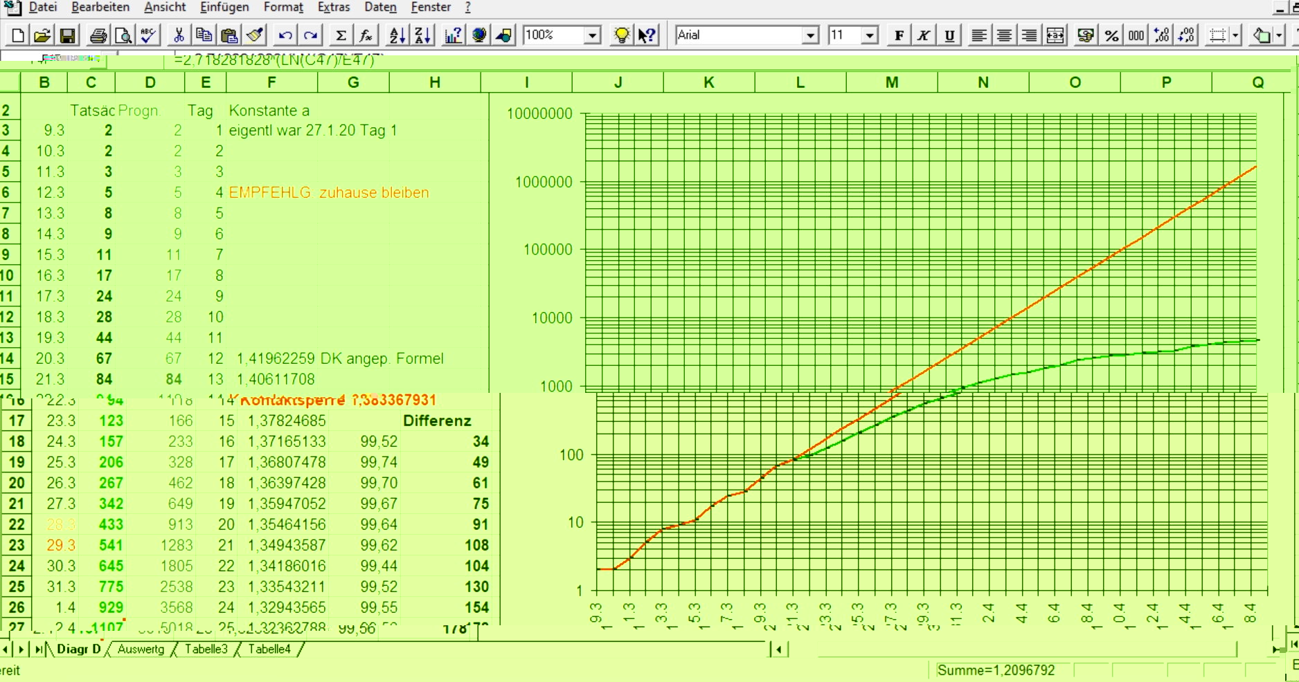 Bild: TOTE des ungebremsten Pademieverlaufs (rot); TOTE des tatsächlichen Pandemieverlaufs (grün)