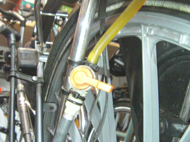 ein Benzinhahn ist mit Kabelbindern an dem Gepackträger festgebunden.