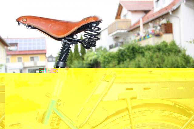 Mit Rock Shox Federsattelzüze mit 50 mm Federweg und Brooks Flyer Sattel.<br />Hierzu mußte ich den Sattelrohrinnendurchmesser mit hilfe zweier Rezudziersattelrohrhülsen von 34,9 auf 31,6 mm und dann noch von 31,6 auf 27,2 mm reduzieren, damit mein Rock Shox Feder verwenden konnte